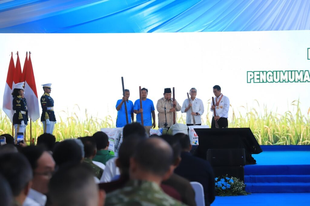 Dalam kegiatan itu, Presiden Prabowo meninjau langsung proses panen raya di area persawahan Karawang sekaligus menyampaikan pernyataan resmi terkait capaian swasembada pangan nasional tahun 2025.